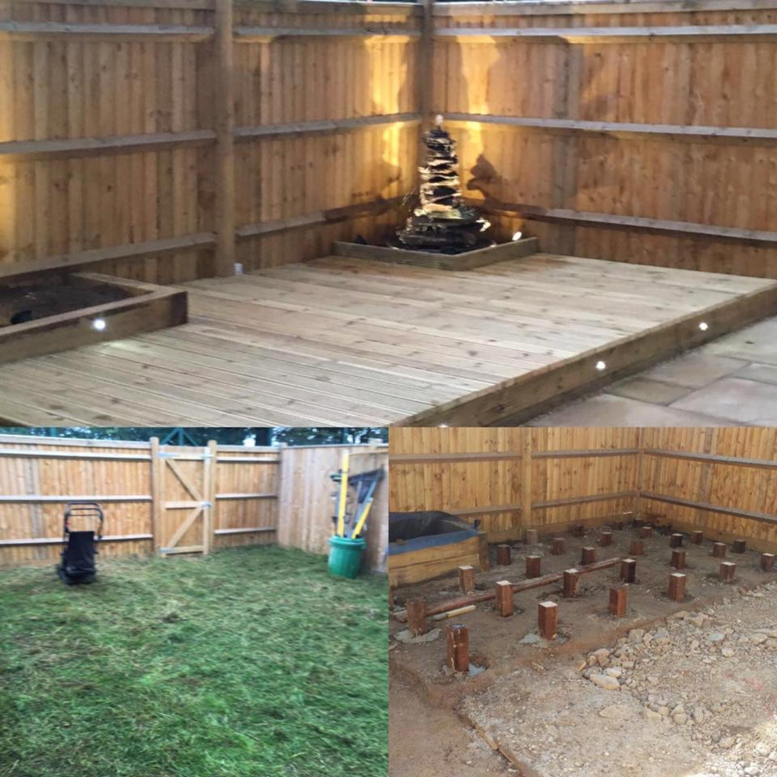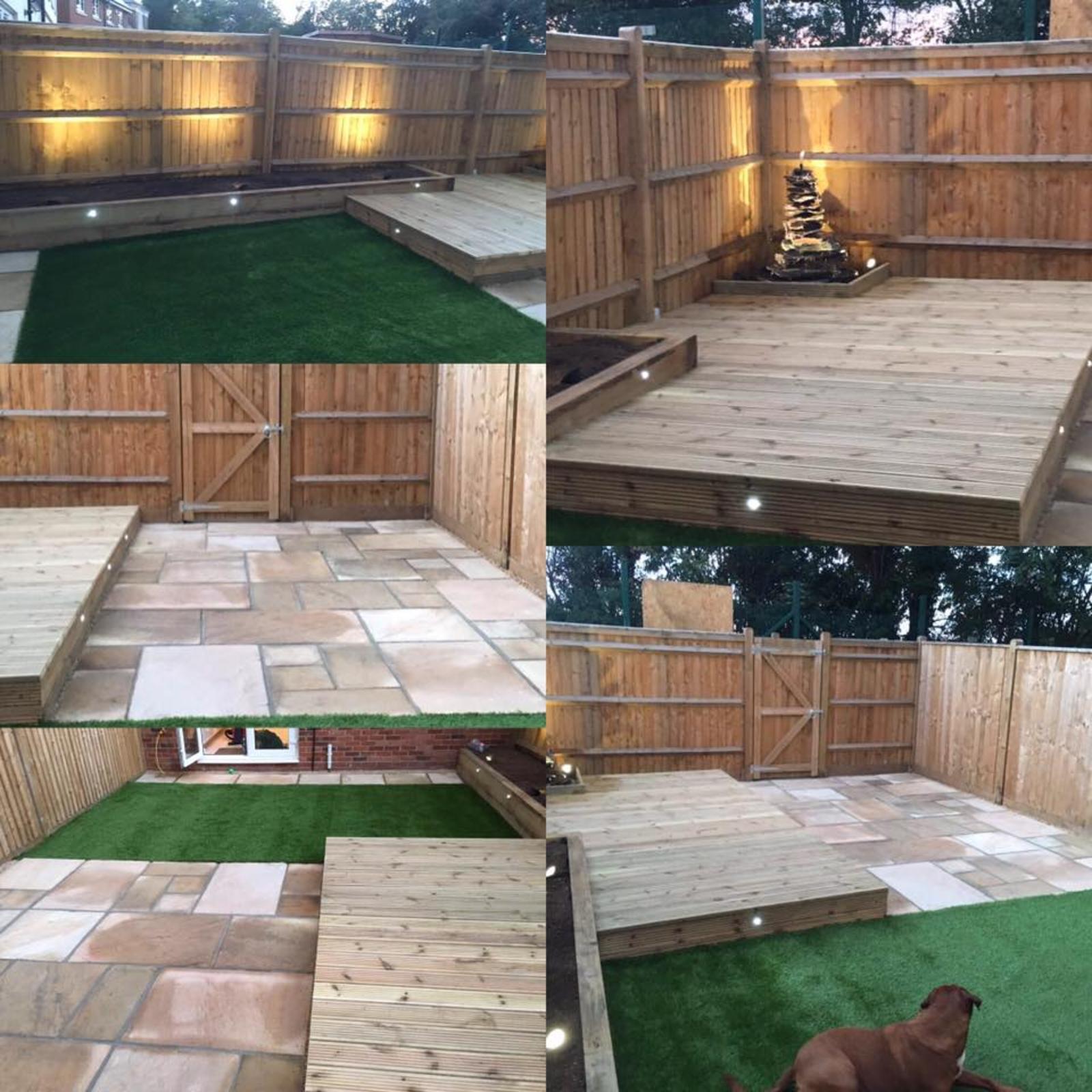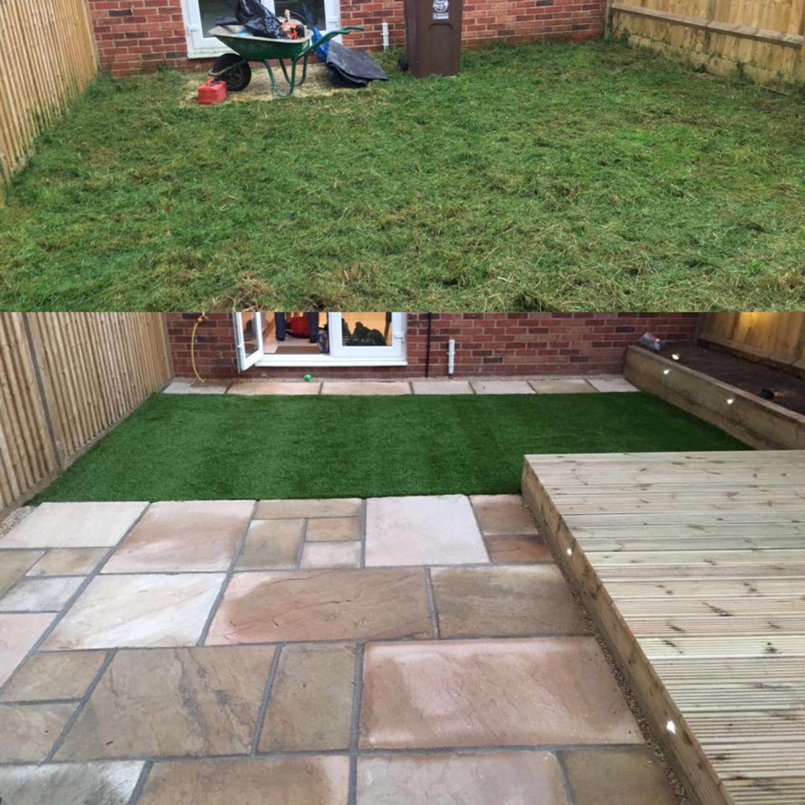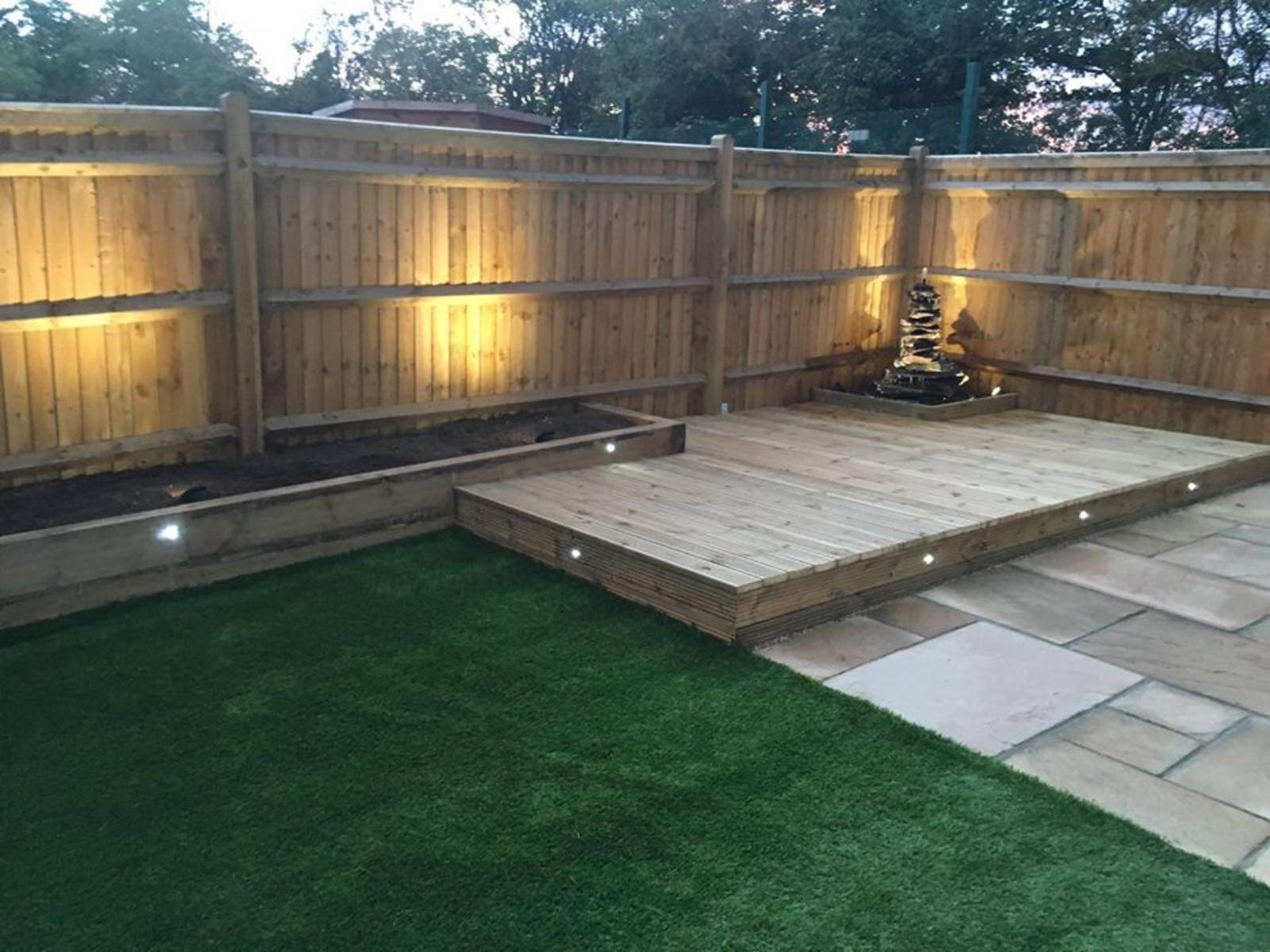 Gardenscape really enjoyed this project. We were able to pull in all our expertise to create a wonderful and tranquil outside space. The garden was transformed with decking with a built in water feature, natural stone patio, raised sleeper flower beds, artifical lawn and contemporary lighting.